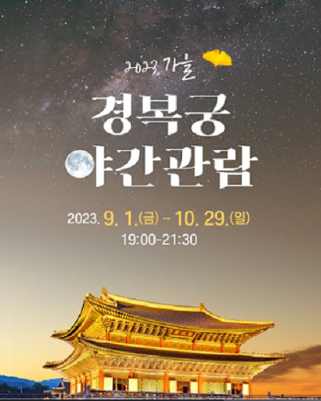 1. 경복궁 야간 관람 가을밤의 정취를 느낄 수 있는 광화문, 홍례문, 근정전, 경회루, 사정전, 강녕전, 교태전, 마미산 권역등을 거닐며, 경복궁의 밤을 만날 수 있는 고궁 탐방 프로그램입니다. ● 기 간 : 2023.09.1. (금) ~ 2023.10.29. (일) ※ 관람 없는 날 : 매주 월, 화요일, 10. 4(대체 휴궁일) ● 시 간 : 19:00 ~ 21:30 (21:30 입장 마감) ● 장 소 : 경복궁 ● 입장료 : 3.000원 ● 사전예매 : 11번가티켓 단독판매 , 1일 2700매 경복궁예매바로가기 2. 2023 한강불빛공연 드론라이트쇼 올봄, 한강 밤하늘을 수놓으며 장관을 연출했던 ‘2023 한강불빛공연(드론 라이트 쇼)’이 가을을 맞아 더 화려하고 풍성한 볼거리로 돌아왔습니다. 최..