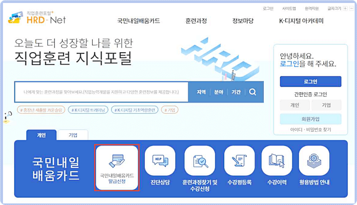 2. 직업훈련포털 사이트 HRD-Net(www.hrd.go.kr)에 접속하여 '국민내일배움카드 발급신청' 클릭