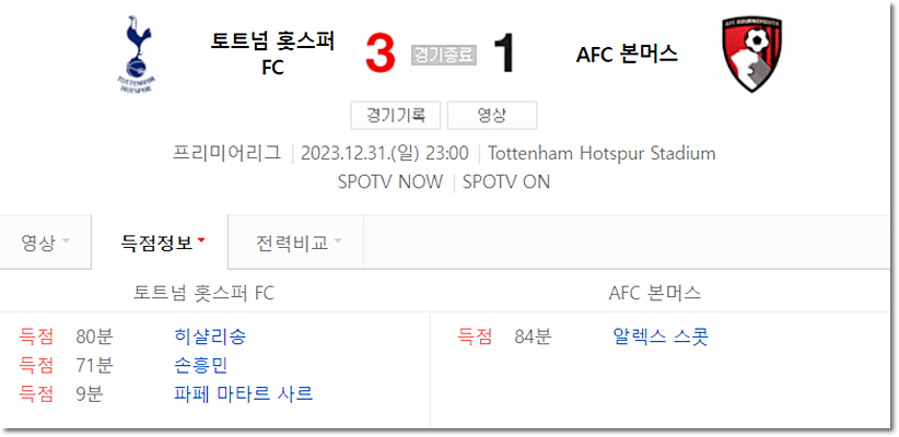 토트넘은 전반 9분 파프 사르의 정확한 오른발 슛이 골망을 가르며 1 : 0으로 전반전을 마무리되면서 한국 시간으로 2024년 새해가 밝았습니다.