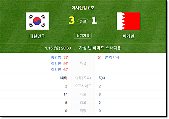2023 카타르 아시안컵 E조 첫 경기 대한민국 vs 바레인에서 3-1 승리를 거뒀습니다.