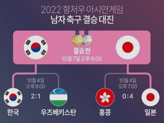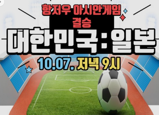 2022 항저우 아시안게임 남자 축구 결승 2023년 10월 7일 저녁 9시 대한민국 : 일본 , 대한민국 선수분들께 파이팅 외쳐봅니다.