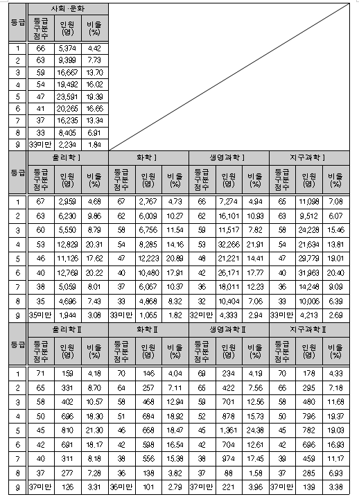 | 등급 | 물리학Ⅰ | 화학Ⅰ | 생명과학Ⅰ | 지구과학Ⅰ | ||||||||