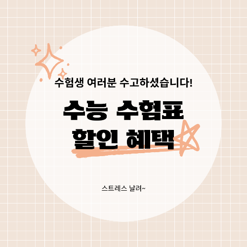 2025학년도 수능 수험생 여러분, 수고 많으셨습니다! 🎉수능을 마친 여러분을 위해 다양한 '수험표 할인' 혜택 이벤트를 소개해 드릴게요. 이제 스트레스를 날려 버리고 마음껏 즐겨 보세요!    놀이동산 할인 혜택 🎢 수험생 여러분을 위한 놀이동산 할인 혜택이 준비되어 있어요!  - 롯데월드 : 최대 52% 할인, 어드벤처 종일권 26,000원 - 에버랜드 : 종일권 21,000원, 동반인 최대 3인까지 30,000원 구매 가능- 서울랜드 : 수험생 본인 동반 2인 61% 할인 2만 5백 원 파크이용권    롯데월드 어드벤처     에버랜드 바로가기  영화관 할인 혜택 🎬 영화관에서도 수험생을 위한 특별한 할인 이벤트가 진행 중이에요. - CGV : 영화 7,000원 콤보 50% 할인 (11월 14..